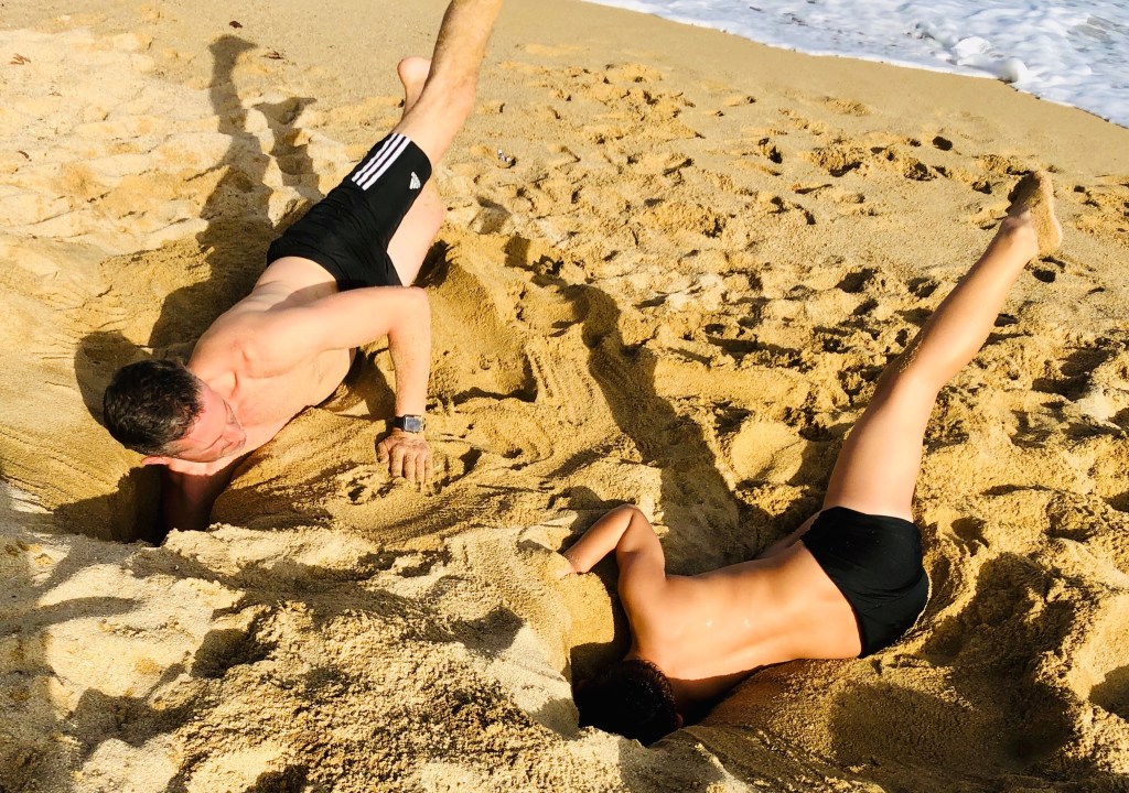 Finalmente conseguí quitar el último puñado de arena y metiéndonos literalmente en el hoyo conseguimos unir nuestras manos en medio del túnel. Fue de esas imágenes que valen un verano. Saltaban, aplaudían, gritaban y lo hacían alrededor todos los niños que hacían corro… y nosotros llevados por el momento brazos en alto como en una escena final de Rocky.