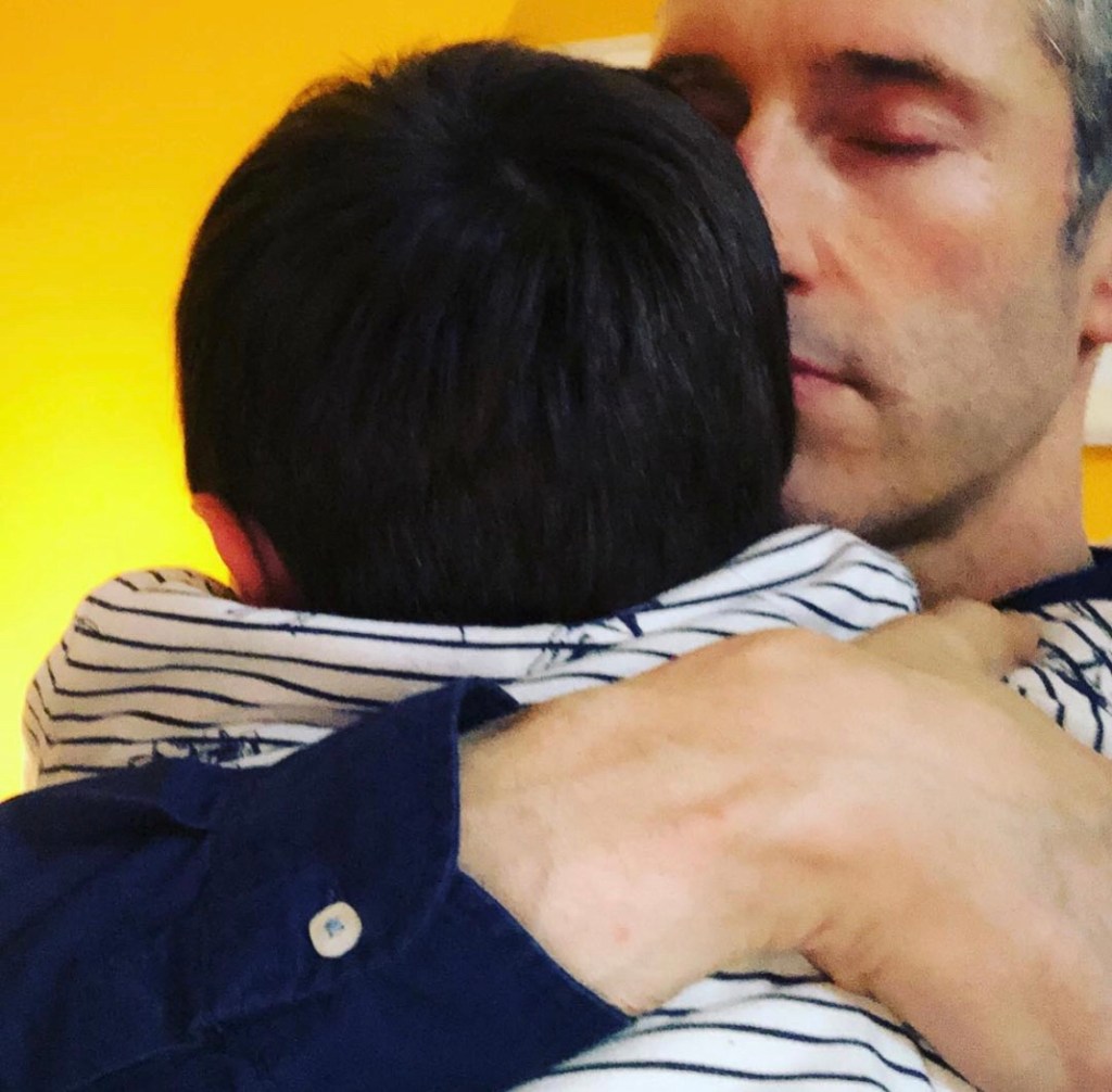 Ayer estaba dándole las buenas noches a J y escuché un sollozo en el comedor. Cuando llegué P estaba sentado en el borde del sofá, emocionado… al verlo se senté junto a él y al abrir los brazos rápidamente se me abrazó con fuerza y notaba cómo le caían las lágrimas…